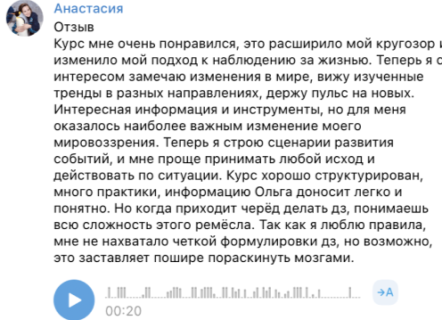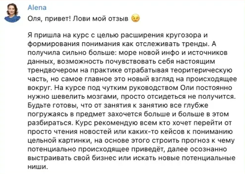 Курс мне очень понравился, это расширило мой кругозор и изменило мой подход к наблюдению за жизнью. Теперь я с интересом замечаю изменения в мире, вижу изученные тренды в разных направлениях, держу пульс на новых. Интересная информация и инструменты, но для меня оказалось наиболее важным изменение моего мировоззрения.