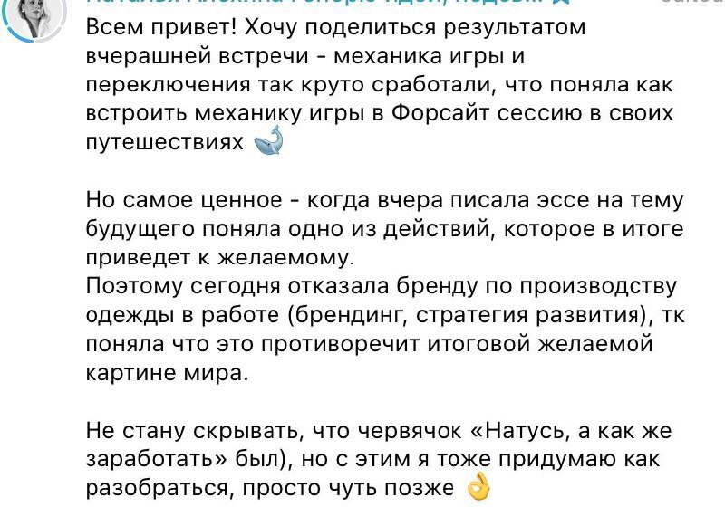«Механика игры и переключения так круто сработали, что поняла как встроить механику игры в форсайт сессию в своих путешествиях»